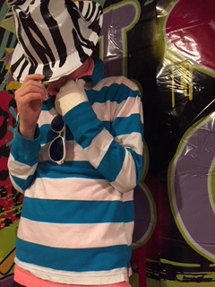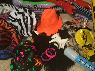 And, my favorite, they had a ball with an 80s photo booth. This started with an inexpensive backdrop from Party City. Then, we stocked a basket with 80s fashions – crazy bright hats, fake mustaches, white gloves, net gloves, a net shirt, gold and neon bling, sunglasses, a microphone, and inflatable instruments, all from Party City and Walmart. The kids dressed up and took pictures all evening, and the photos are great keepsakes, too.