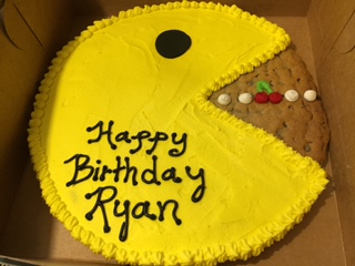 What to do for a cake? My husband didn’t want a cake at all, but he asked for a big iced cookie instead. Perfect – the shape of Pac-Man! This dessert was made by my friend Laura at Sweet Treats by Laura, and it was so, SO good!